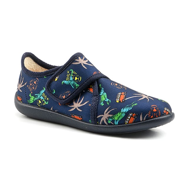 The Nowlan slippers from the Bellamy brand combine style and comfort to offer a warm and soft experience. Designed for home or relaxing moments in winter, these textile slippers feature a colorful top adorned with an exotic animal motif like dinosaurs, tigers and imaginary creatures in green, orange, yellow and red on a marine background. A fabric tab with scratch closure adds a practical touch. The textile interior and leather insole ensure maximum softness with every step. The durable rubber sole ensures solid stability while keeping light weight. Available in navy blue, these slippers are part of the functional and comfortable range, ideal for children looking for warmth, flexibility and a lively design. -