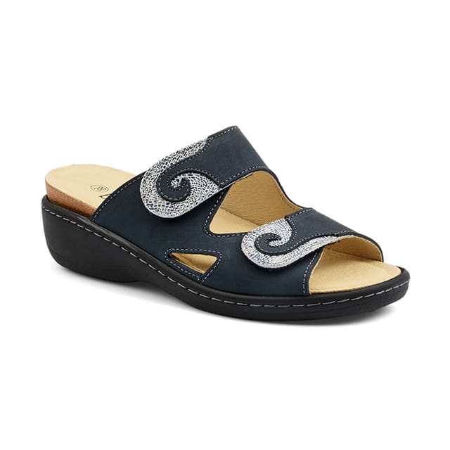 Discover the Sandals Marina of the brand Belvida, ideal for summer days. These navy nubuck flat sandals are designed for optimal comfort. The top and upper are made of nubuck, while the lining is made of leather. The insole is also made of leather, removable for better adaptability. The outsole is made of rubber, offering exceptional lightness and breathability. The heel measures 40 mm, offering a discreet height while maintaining comfort. Details of these Marina sandals include a wedge heel nubuck leather mule, perfect for beach days or holidays. The Marina sandals are also designed for everyday wear, with a casual style that will suit any occasion. -