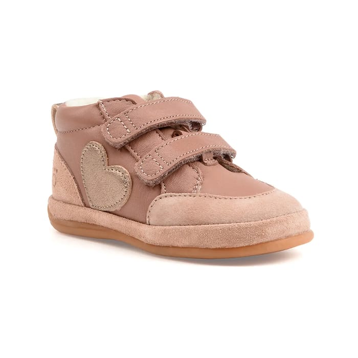 The ankle boot Aubépine Heart filled of the brand Benjie combines elegance and comfort for toddlers. Designed in soft leather, it offers perfect support and immediate comfort thanks to its virgin wool lining, natural and pleasant to the touch. The leather tip with stitching details around a heart patch on the side adds a touch of charm. The two Velcro laces, one at the foot and the other near the ankle, allow an easy and secure closure. The rubber sole ensures optimal durability, while the removable insole makes washing easy. In pink, this ankle boot fits perfectly in a chic, versatile range designed for everyday use. It is ideal for first steps, offering unparalleled comfort for toddlers on the move. -