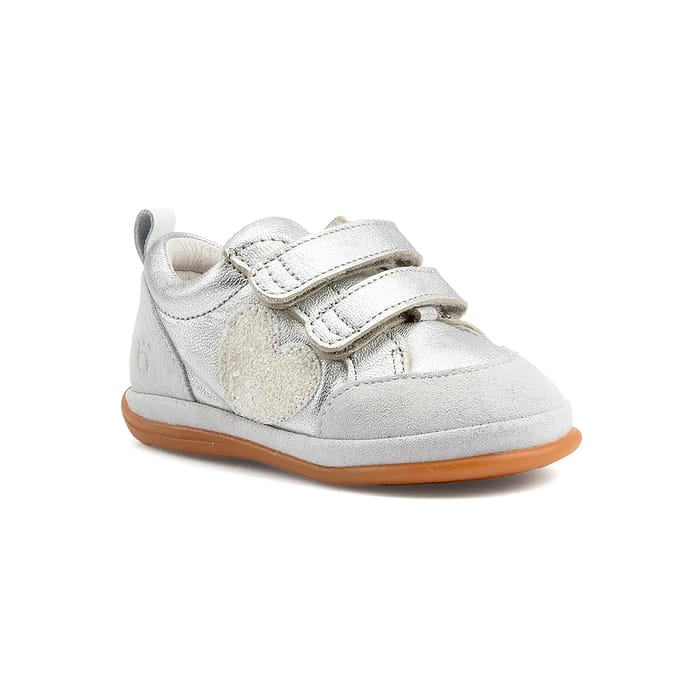 The blueberry ankle boots from the brand Benjie are versatile and comfortable shoes designed for general and everyday use. They feature chic style with leather and suede tops and uppers, providing optimal support and comfort. The leather lining provides extra protection and durability. The leather insoles and rubber outsoles guarantee a strong grip and flexibility. Details of the design include decorative seams around the edges and a "6" number printed near the side. The shoes are equipped with two Velcro bands for an easy and fast fit. The Myrtille shoes are available in silver, a color that pairs perfectly with children's fashion accessories. -