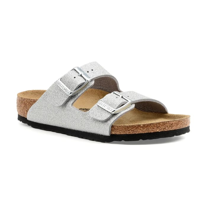 The flat sandals Birkenstock Arizona kids combine style and comfort for children. Made in Germany, these iconic sandals are inspired by the famous footbed that naturally supports the sole of the foot. The silver glitter synthetic top adds a trendy twist, while the two adjustable metal flanges ensure a good fit. The soft fabric interior and leather insole provide excellent breathability and lasting comfort. The rubber outsole ensures good stability without compromising lightness. Ideal for the beach, holidays or everyday life, these mules are perfect for a casual and summery outfit. An essential fashion accessory for the summer. -
