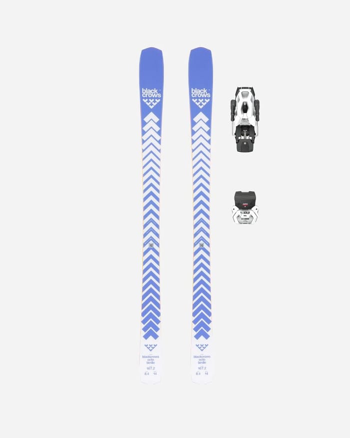 The W's Octo Birdie + ATTACK LYT 11 GW DEMO BR.95[F]s.wh/bk from Black Crows combine style and performance in a piste ski model designed for discerning enthusiasts. Featuring a design combining blue and white herringbone patterns running along each ski, these skis display a dynamic aesthetic with a striking graphic signature. The tip of the skis sports a discreet triangular pattern, while the details at the end, such as "octo birdie", "167.2" and the measures "8.4 14", add a technical touch. The model is part of the functional and technical range, offering increased downhill stability and optimal handling on all terrains. Ideal for alpine skiing as well as for leisure or competition, this ski meets the requirements of hardcore skiers who seek constant performance and total control. -