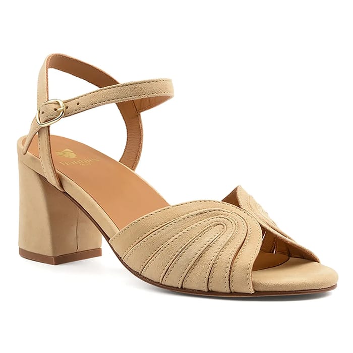 Discover the EILEEN sandals from the brand Bobbies, perfect for parties, ceremonies or a chic office day. These 60mm heeled sandals are designed to offer unparalleled refinement and comfort. The top and upper are suede, while the lining and insole are leather. The sole itself is made of leather with a rubber pad for exceptional durability. The EILEEN sandals feature an elegant design with cross straps that fit the shape of the foot, as well as a collared strap with a small buckle for an easy fit. The insole is also made of leather, with a visible marking text printed on it. The EILEEN sandals are available in beige, a neutral and elegant color that will suit any occasion. -