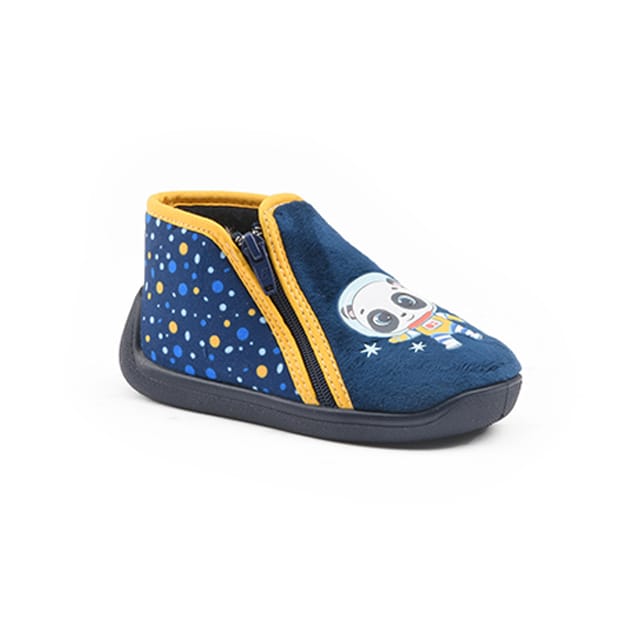 The Comet slippers from the brand Bossi are designed for comfort and softness. These functional and comfortable slippers are ideal for winter or for relaxation at home. Their top and upper are made of textile, while the lining is also made of textile to offer a feeling of warmth and comfort. The insole is made of removable leather, offering extra softness. The outsole is made of rubber, offering durability and flexibility. The Comet slippers are available in a pretty navy blue color with multicolored dots in yellow, light blue and white. A shiny yellow zipper along one leg adds a playful touch to these slippers. -