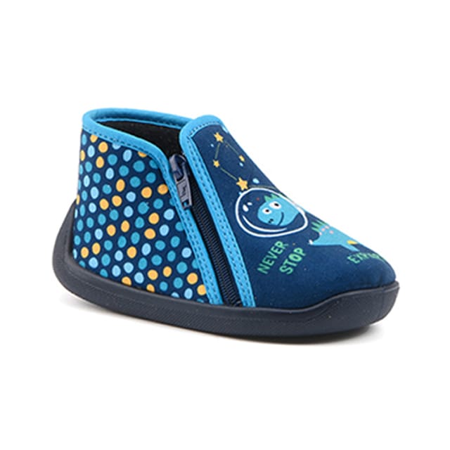 Discover the Dino slippers from the brand Bossi, ideal for small explorers of the universe. These comfortable and functional slippers are designed for everyday use, whether it's home or relaxation. Their softness and flexibility ensure a pleasant fit, while their rubber sole offers durability and protection suitable for active activities. The Dino slippers feature a textile top and lining, providing a feeling of warmth and comfort. Their removable leather insole allows for easy adaptation to wear. The details of the slipper, such as the textile slipper and rubber sole, contribute to their functional appearance. The Dino slippers are available in a pretty navy blue color, embellished with touches of yellow and blue and yellow dots on the side panels. An astronaut in space suits, surrounded by stars and constellations, is illustrated on the front of the slipper, while the phrase "NEVER STOP EXPLORING" is printed near the back of the slipper. The Dino slippers are perfect for children who love to explore and play, and who enjoy space adventures. -