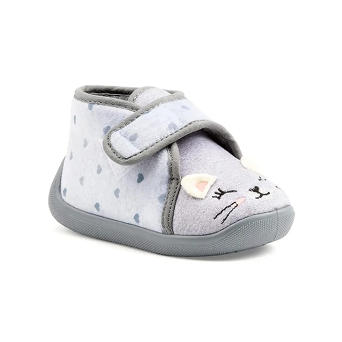 The Slippers Galia from the Bossi brand are designed to offer exceptional comfort and softness. These functional and comfortable slippers are ideal for winter, home or relaxation. Their textile upper and upper ensure optimal flexibility and flexibility. The textile lining ensures additional insulation and warmth. The removable leather insoles provide extra protection for the feet. The rubber outsoles are perfect for indoor use or for gentle outdoor activities. The Slippers Galia also feature delicate details, such as closed eyes with eyelashes, whiskers and embroidered ears, which adorn the face of the textile slipper. An elastic closure system and a buckle closure strap ensure a secure fastening. The Slippers Galia are available in grey, with a pretty pattern of blue hearts on a white background. -