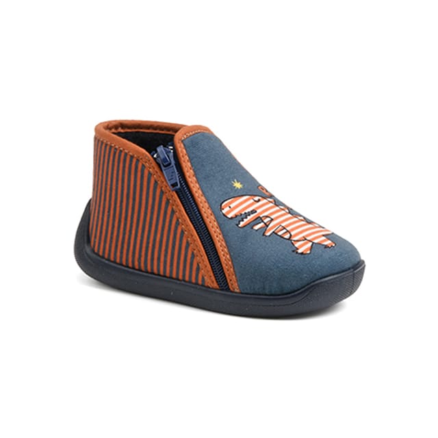 Discover the Slippers Graff of the brand Bossi, ideal for cold winter days. These functional and comfortable slippers are designed to bring warmth and softness to the feet of your little ones. The top and lining are made of textile, offering exceptional flexibility and flexibility. The insole is made of removable leather, guaranteeing optimal comfort. The rubber outsole offers durability and wear resistance. The Slippers Graff are available in a range of multi-coloured colours, including a multi-coloured version that highlights the vertical orange and navy stripes on the top. An elephant wearing a striped blouse is embroidered near the front of the slipper, while a small yellow star is present next to it. The Slippers Graff are perfect for relaxing moments at home, whether it's cold or hot. -