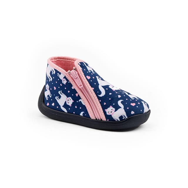 Discover the Miniu slippers from the brand Bossi, ideal for cold winter days. These comfortable slippers are designed to offer you exceptional softness and flexibility. Their top and upper are made of textile, while their lining is also made of textile for a feeling of maximum comfort. The insole is leather, removable and easy to clean. The outsole is made of rubber, offering durability and wear resistance. Minou slippers are available in navy blue, a rich and elegant color that will perfectly suit your winter outfits. With their functional design, these slippers are ideal for spending the day at home or for relaxation in winter. The details of these slippers are truly charming, with white cat prints and little hearts that add a touch of personality. The pink zipper adds a touch of color and softness. The Miniu slippers from the brand Bossi are a perfect choice for those who seek exceptional comfort and softness while being functional and practical. -