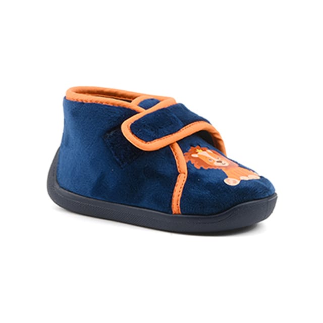 The P'tit lion slippers from the brand Bossi are designed for comfort and functionality. These house shoes are ideal for children who like to play indoors during the winter. The top and lining are made of textile, offering exceptional softness and flexibility. The removable leather insole ensures a perfect fit. The rubber outsole offers solid protection and good thermal insulation. The slipper details, such as the embroidered lion face and orange stripes, add a personality touch. The navy blue color is an elegant touch that will suit all tastes. The P'tit lion slippers are designed to offer optimal warmth and softness while being practical and easy to wear. -