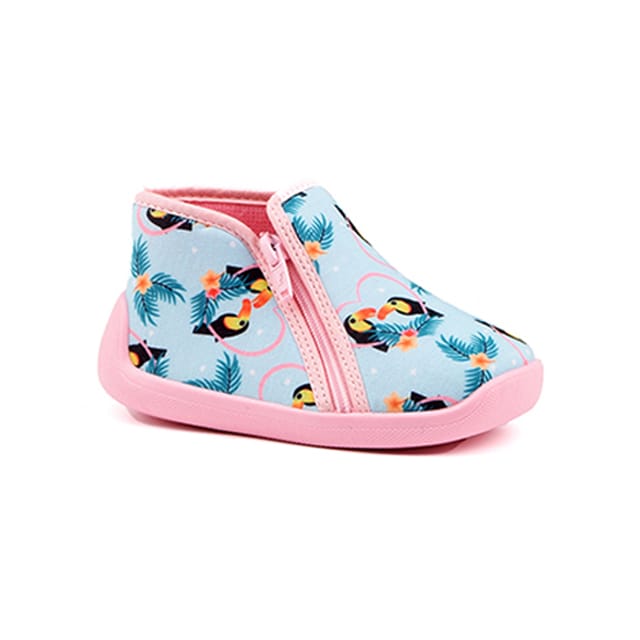 Discover the slippers Green do of the brand Bossi, ideal for small feet who like to feel warm and comfortable in winter. These functional and comfortable slippers are designed for everyday use at home or during moments of relaxation. The textile top and lining offer exceptional softness and flexibility, while keeping feet warm. The removable leather outsole ensures optimal comfort, while the rubber outsole provides solid protection. The slipper details, such as the textile slipper and turquoise color, add a touch of color and personality. Pink accents, such as the zipper line and sole edging, add a touch of softness and femininity. The Green do slippers are perfect for children who love bright colors and exotic patterns, such as toucans and tropical leaves. -