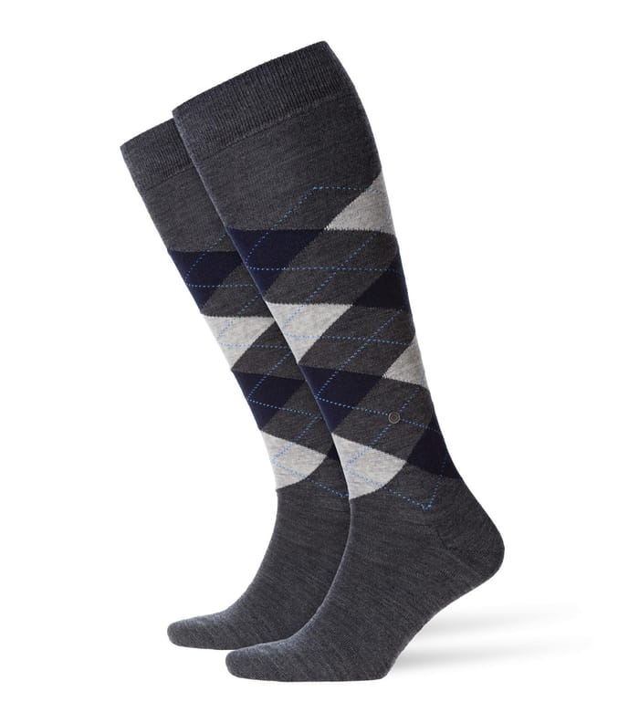 The City socks M's Edinburgh by the brand Burlington offer a classic and elegant style for everyday occasions, parties or the office. These high-quality socks are characterized by exceptional finesse and comfort. Their dark grey colors serve as the basis for a sophisticated argyle pattern, composed of blues, light greys and whites, which stands out with diagonal diamonds delimited by thin blue lines. A discreet circular logo is visible on the side near the foot joint. The ribbed cord at the top end ensures a comfortable fit around the leg. -