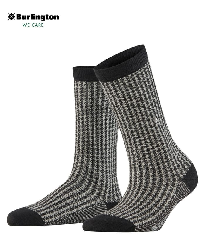 The W's PEPITA socks from the brand Burlington are elegant and classic city socks. Made of 73% virgin wool and 25% polyamide (8% recycled) with 2% elastane, they offer exceptional comfort and breathability. The socks feature a black and white houndstooth pattern, while the upper edges are trimmed with a solid black lace. The heel and foot parts are reinforced for increased durability. A discreet logo is visible on one of the socks near the bow, accompanied by the motto "WE CARE" in green text. These socks are ideal for everyday use, evenings or for the office. -