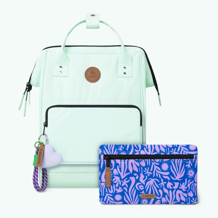 The AMMAN MEDIUM SIZE backpack from the Cabaia brand combines versatility and robustness to adapt to your daily needs, whether it is for business, study or getaways in the heart of nature. Designed in a fresh and elegant green, this model stands out for its sober and timeless design, marked by the discreet signature "CABAIA" at the top of the bag. Featuring a 100% resistant and durable polyester lining, it guarantees optimal protection for your business, while ensuring prolonged comfort thanks to its ergonomic straps. Its functional appearance results in a convenient storage system, ideal for organizing your essentials efficiently. The secure closure with black zippers enhances the strength of the bag, while the front pocket provides quick access to your everyday items. Complete with a pouch with pink floral patterns and black details, this backpack comes with an additional aesthetic and useful accessory, also stamped with the Cabaia logo. An additional detail, such as the braided purple key ring adorned with a heart-shaped pendant, adds a personal and practical touch to this versatile piece of equipment. Perfect for combining style and functionality, this backpack embodies the essence of an indispensable accessory, both robust and elegant. -
