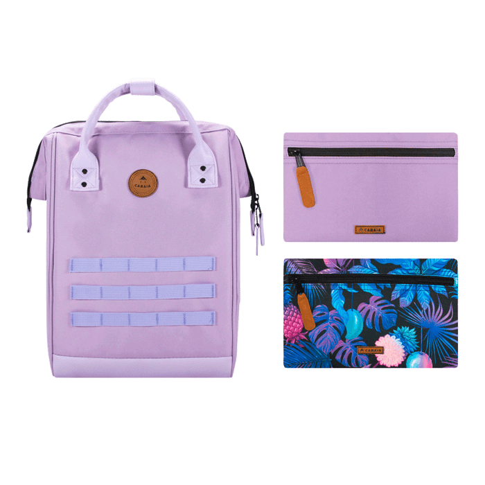 Rucksack Cabaia Jaipur Medium Size 23L: a versatile bag for work, study and hiking. Designed for comfort and durability, this backpack features a back and shoulder belt for optimal reach. The lining and top are made of 100% polyester, while the upper is made of polyurethane. The bag features three horizontal stripes on the front, as well as two additional pockets: a pink pocket with a black zipper handle and an exotic patterned pocket with palm trees and pineapples in blue, purple and pink on a dark background. The Cabaia logo is visible on the pockets and the bag. The bag is available in purple, a bright and attractive color. -