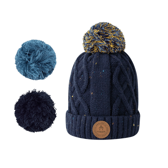 The K's Apple Juice Baby of the brand Cabaia is a navy wool cap designed for outdoor activities and cold days. This functional and casual beanie offers protection from the cold and optimal warmth. Its style is marked by a knitting pattern in multicolored cables and scattered spots throughout the surface. The bottom of the cap is equipped with an elastic band for an accurate fit. A round brown leather patch and a multicoloured wool tassel, composed of yellow, white and dark shades, adorn the top of the cap. Two other pompoms are available separately: a light and soft blue, and a darker and also soft navy blue. -