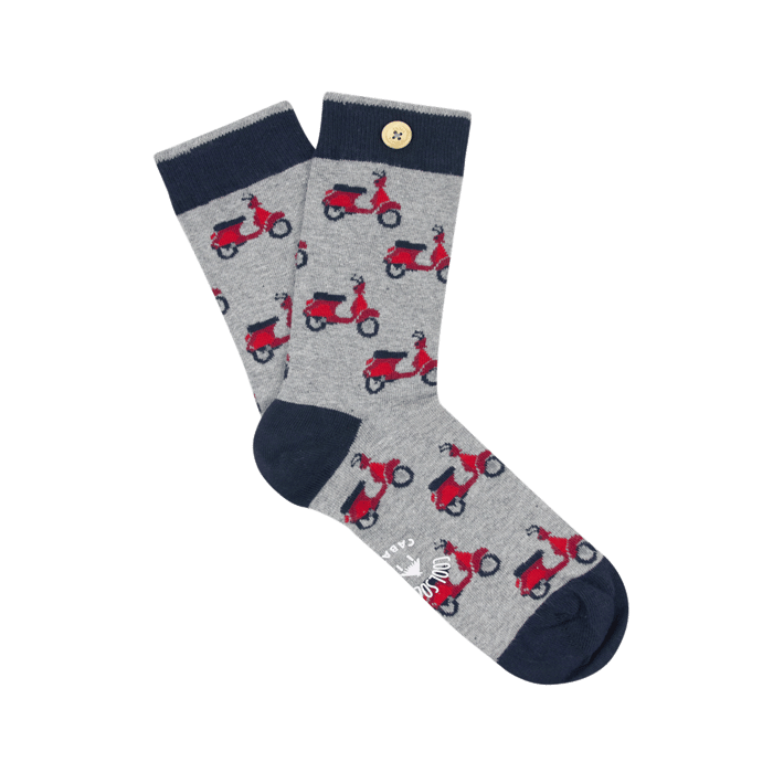 Discover the town socks M's ALBAN & ELODIE of the brand Cabaia. These elegant and classic socks are made of 80% organic cotton, 18% polyamide and 2% elastane, guaranteeing optimal comfort throughout the day. The thinness and breathability of these socks make them an ideal choice for formal occasions or for your daily life. The M's ALBAN & ELODIE socks feature a pretty palette of grey, with darker color details for the foot, heel and upper edge. The red scooter designs add a touch of personality to these socks. A small wooden button is attached to a sock, near the top, for a nice decorative detail. The M's ALBAN & ELODIE socks are perfect for office occasions, evenings or your daily life. They offer exceptional comfort and finesse, making them an excellent choice for lovers of style and comfort. -