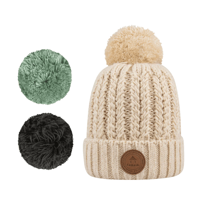 The MOSCOW MULE Beanie from the brand Cabaia is a functional and casual fashion accessory for winter and outdoor activities. Made of 90% acrylic and 10% polyamide, this cap is warm and protects the head from the weather. Its style is simple and elegant, with a knit cable top and ribbed stripe at the bottom. A brown leather patch displays the Cabaia brand logo, surrounded by an emblem of mountains and forests. The hat is available with two pom-pom options: one in green wool and another in black wool. The beige color of this beanie makes it a perfect accessory for cold days, while being casual enough to be worn every day.