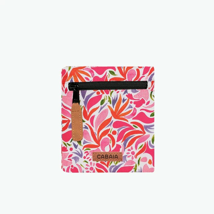 The SANTORINI clutch of the brand Cabaia combines elegance and practicality to sublimate your evenings, your events or your office days. Designed in a chic and stylish style, this side pocket stands out for its vibrant floral design, where shades of pink, orange, green and purple blend on a white background. Stylized patterns of leaves and flowers bring a touch of originality and softness to this essential accessory. Made with a 100% recycled polyester lining, it combines durability and respect for the environment. Its black zip closure, embellished with a brown leather tab for a fluid opening gesture, ensures the safety of your little treasures. A discreet label "CABAIA" is embroidered on the front, recalling the excellence of the brand. Perfect for storing your essentials while adding a touch of elegance to your outfit, this pouch embodies both utility and sophistication. Ideal for special occasions as for everyday life, it integrates with thanks to all your moments. -