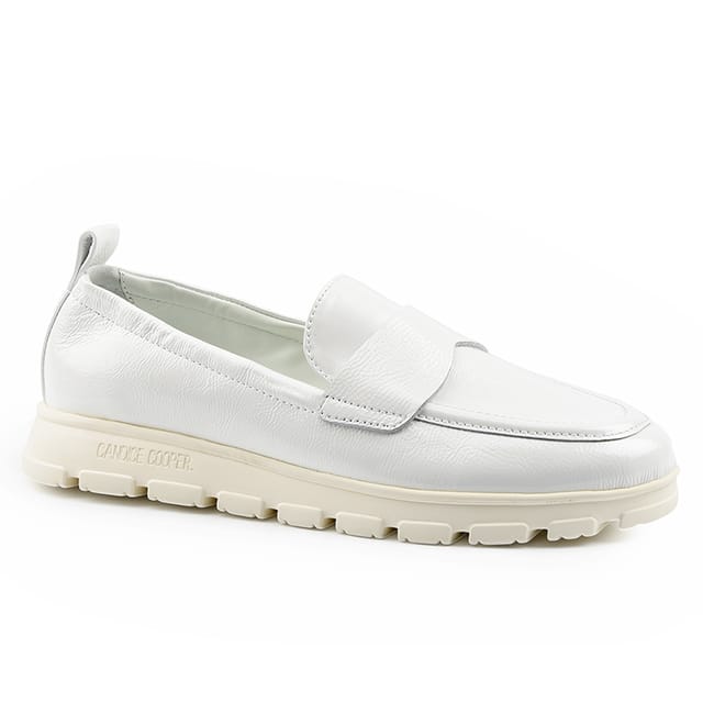 The Classic loafers Ninja Moc from Candice Cooper are designed for stylish styling and ultimate comfort. These patent leather loafers feature a leather lining and leather insole, ensuring a feeling of comfort and quality. The synthetic outsole offers durability and wear resistance. The patent leather upper and upper give a refined and sophisticated appearance. The design details, such as the visible stitching and the small draw heel, demonstrate a care for manufacturing quality. The Ninja Moc Loafers are available in white and are ideal for formal or semi-formal occasions, such as evenings or events. -