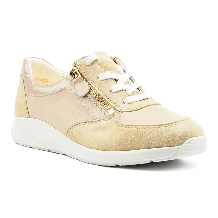 The shoes Valencia of the brand Christian Dietz are sneakers designed for lovers of fashion and comfort. This pair of shoes is made of patent leather for the top and upper, offering a touch of sophistication. The velvet leather added on some parts enhances the softness and versatility of these shoes. The leather lining ensures extra protection and a comfortable feel. The leather insoles are removable, making maintenance and replacement easy. Gum outsoles offer exceptional durability and flexibility. The heels measure 30 mm, offering an ideal height for daily outings. Details of the shoe include a leather sneaker that adds a touch of class. Golden laces and zippers add a touch of sophistication. The Valencia shoes are available in a single color, beige, which pairs perfectly with fashion clothes. These shoes are designed for everyday outings, walking and leisure, offering a perfect blend of comfort and style. -