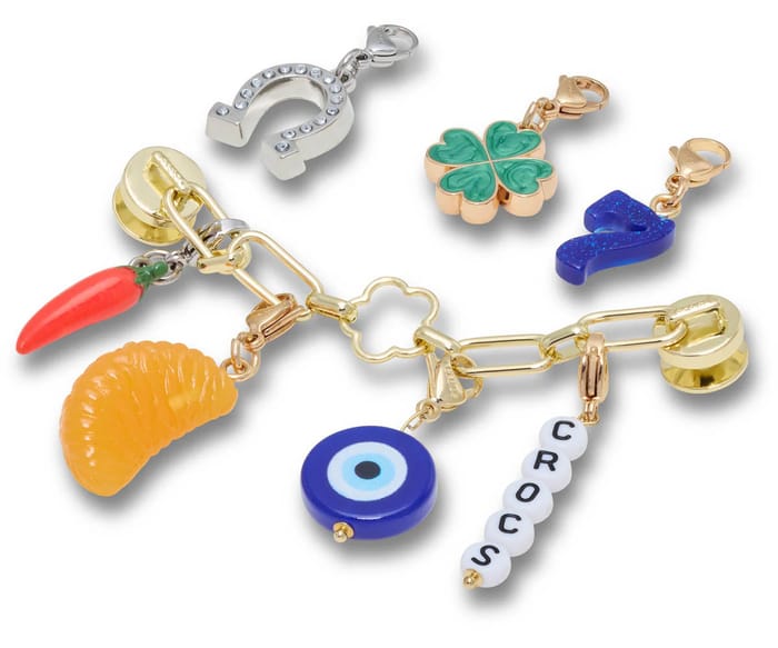 Add a touch of originality and personality to your Crocs with the **Adjustable Fashion Accessory Charm Chain Lucky**, an adjustable bracelet designed to sublimate your favorite shoes. Combining elegance and fantasy, this jewel of accompaniment is distinguished by its golden chain and its varied charms, each bearing a unique symbolism. Cut into seven iconic pendants, this bracelet features a bold mix of motifs: a silver horseshoe glittering with small crystals, a green clover with pink outlines and golden accents, a sparkling blue sneaker shaped like a strapped sandal, an orange crescent made of smooth, velvety material, a pungent red chili pepper, and an evil blue eye with concentric circles. Not to mention the white beads forming the word "CROCS" in black letters, strengthening the identity of the brand. Versatile and timeless, this accessory adapts to any occasion, whether it is a casual day, an evening with friends or a special event. Lightweight and easy to adjust, it clips directly to the loop of your Crocs for an instantly personalized look. Perfect for those who love to display their style with panache, this bracelet turns a simple shoe into a fashion piece in its own right, where every detail tells a story. -