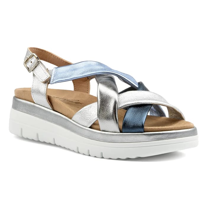 Discover the Sami08 wedge sandals from the brand Cypres, ideal for evenings and summer outings. This multicolored metallic leather sandal stands out for its silver and blue crispcross design that adds an elegant touch of style. The adjustable heel belt with buckle closure ensures a precise fit and optimal safety. The leather lining ensures optimal comfort throughout the day. The removable textile insole allows to customize your comfort. The synthetic sole offers exceptional stability and durability. The 50 mm heels add a touch of sophistication to these sandals. The Sami08 sandals are perfect for women looking for an elegant and functional style for summer evenings. -
