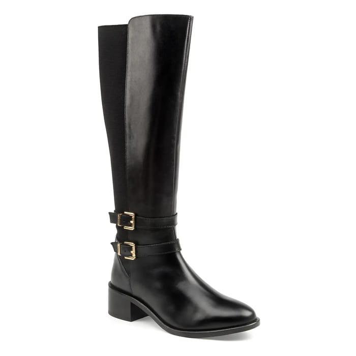 The Tatter boots from the brand Dune offer an elegant and casual style, ideal for outings, work or a simple daily walk. Designed in smooth, polished leather, they highlight their elegant appearance with waist-adjustable straps and golden metal elements that add sophistication. The 45 mm heel ensures a natural height effect without compromising comfort. Featuring a synthetic sole and outsole, these boots offer excellent comfort and protection. The fabric lining ensures a good fit and a comfortable feeling on a daily basis. The leather design, with a print detail visible on the back, makes them easy to carry. These black boots are suitable for all types of activities, whether for business or casual wear, thanks to their elegance and modern look. -