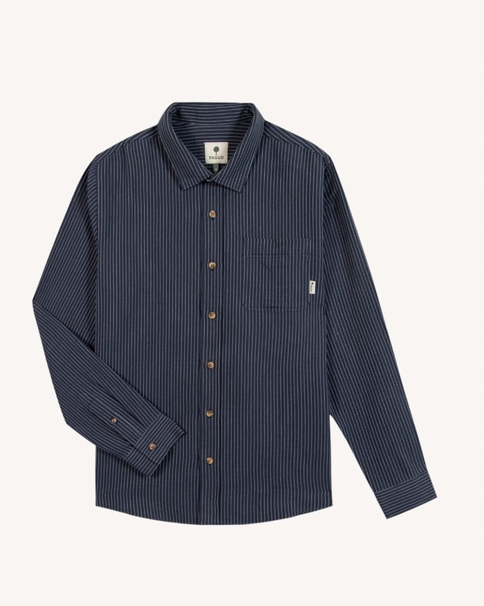 The M's SIGNY SHIRT WOVEN shirt from the Faguo brand combines timeless elegance with discreet refinement to enhance every formal outfit. Designed for professional or ceremonial occasions, this navy blue long-sleeved shirt stands out for its sober design and neat details. The thin white vertical stripes, almost imperceptible, bring a subtle touch of modernity without altering the sobriety of the style. The pointed collar and brown wooden buttons, both discreet and elegant, enhance the chic appearance of the room, while the presence of a chest pocket on the left adds practical functionality. Made to combine comfort and performance, this shirt breathes thanks to its adapted composition, ensuring a feeling of lightness even on the longest days. Its studied fit, both structured and fluid, hugs the silhouettes precisely, offering an impeccable fit for an always impeccable look. Perfect for both office and formal events, this shirt embodies the perfect balance of sophistication and versatility, for style that goes through the seasons without ever getting old-fashioned. -