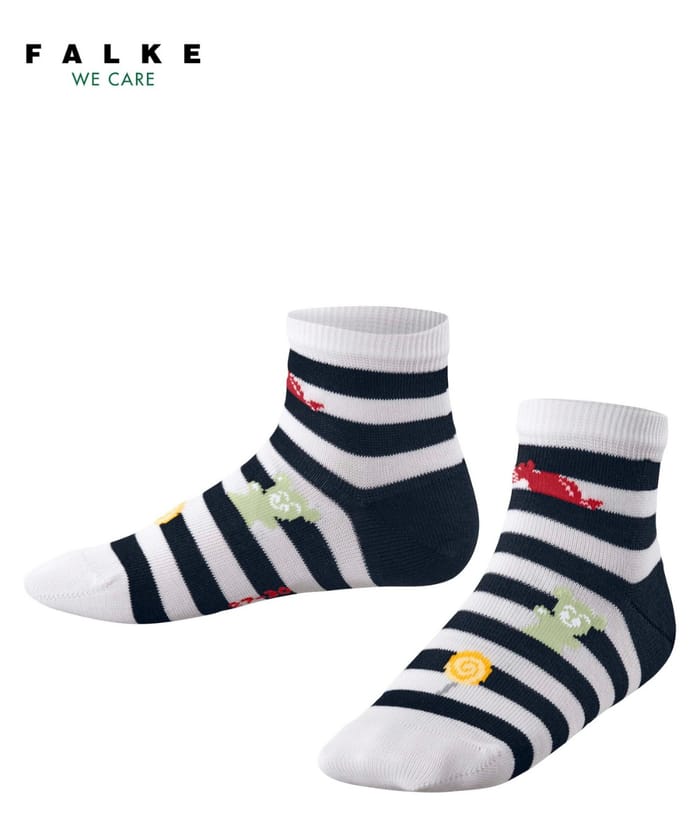 The K's Striped Jellies socks from Falke combine elegance and everyday comfort. Made from a blend of 74% cotton, 25% polyamide and 1% elastane, they offer remarkable finesse and optimal breathability. These city socks are perfect for use in the office or during evening outings, thanks to their classic design and playful touch. Each pair features black and white horizontal stripes, accompanied by colorful graphic details near the end: a green character holding a yellow object on one sock, and a red character moving on the other. The brand name Falke as well as the slogan "WE CARE" are subtly inscribed at the top of the sock, adding a touch of distinction. This model combines light weight, durable comfort and stylish aesthetics for an elegant outfit throughout the day. -