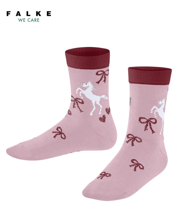 The K's Western Horses socks from the brand Falke combine elegance and comfort in everyday life. Made from a blend of 85% cotton, 12% polyamide, 2% metallic polyamide and 1% elastane, they offer remarkable finesse and optimal breathability. These city socks are perfect for use in the office or during evening outings, thanks to their classic and elegant design. A brown stripe adorns the top of the sock, while white horse motifs and brown knots bring an original touch. The brand name FALKE as well as the slogan "WE CARE" are engraved in black letters above the model, adding a distinctive touch. Ideal for a casual but neat style, these socks combine lightness, comfort and neat aesthetics. -