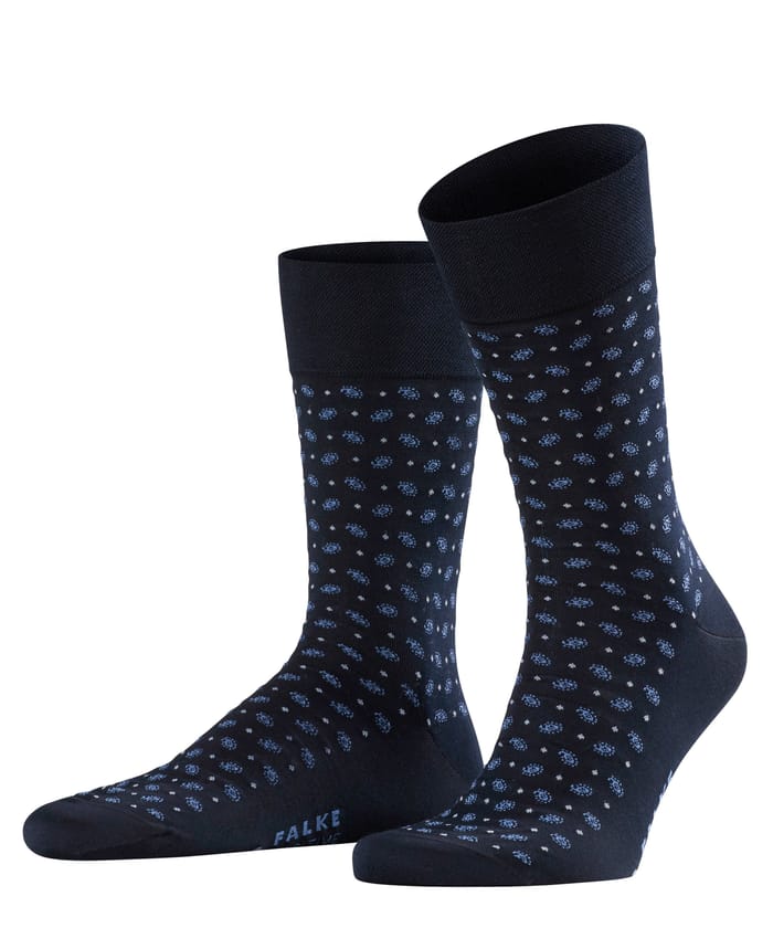 The M's Sensitive Jabot city socks from the Falke brand offer exceptional comfort and finesse. Designed for everyday occasions, evenings or the office, these navy blue socks are elegant and classic. Their design is characterized by colorful patterns and white patterns that add a touch of style. The socks feature knit elbows for a comfortable fit and reinforced heels and soles in solid black fabric for optimal durability. The logo "FALKE" is printed on the side near the foot in light blue letters. The M's Sensitive Jabot socks from Falke offer breathability and optimal comfort throughout the day. -