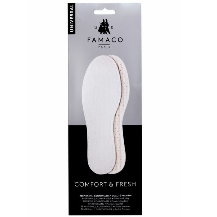 Insoles Comfort & Fresh Sponge of the brand Famaco Paris offer optimal comfort and freshness for your shoes. Designed to improve the support and comfort of your feet, these sponge soles feature a cotton top and upper, providing exceptional breathability. Their breathable and comfortable sponge sole allows for optimal ventilation, while offering a perfect fit for your feet. The Comfort & Fresh Sponge insoles are available in white, a color that symbolizes purity and freshness. Designed to be practical and functional, these insoles are ideal for people looking to improve the comfort of their shoes while enjoying premium quality. -