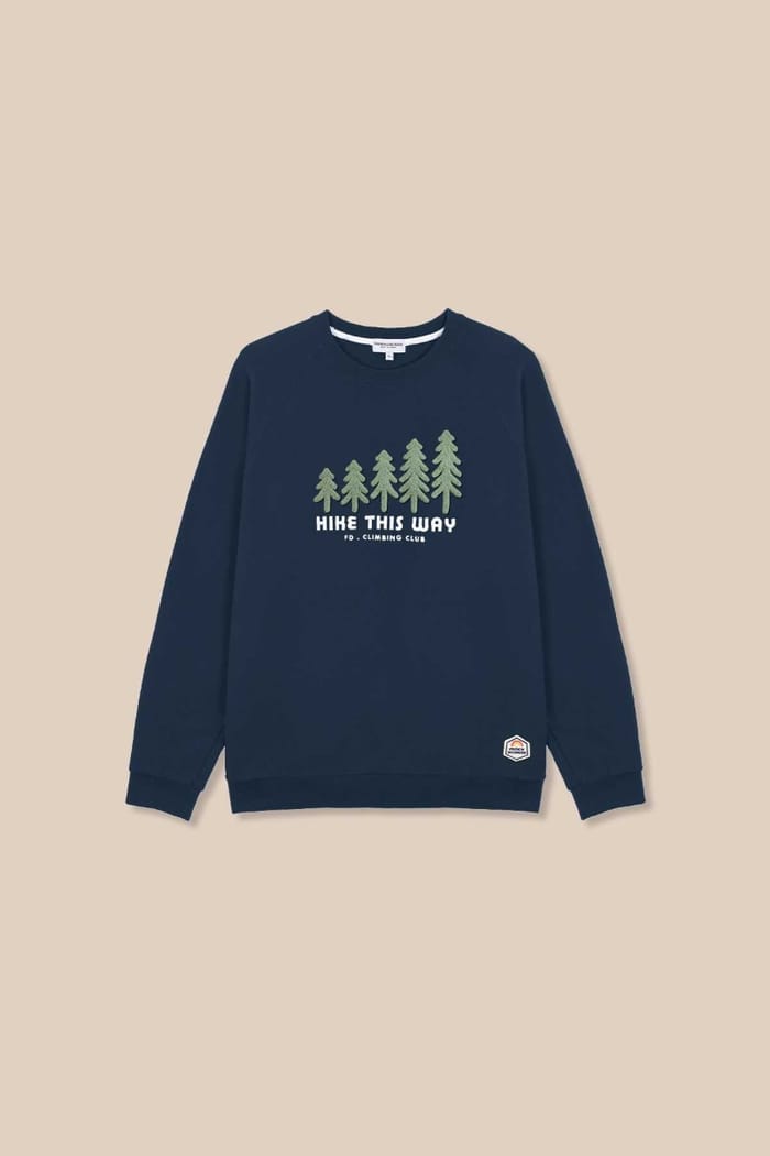 The sweatshirt M's Clyde Warmy HIKE THIS WAY (Broderie) of the brand French disorder embodies a relaxed and warm style, ideal for moments of relaxation or outdoor outings. Designed in a soft and chaotic material, it offers optimal comfort throughout the day. Its round neckline and long sleeves enhance its cozy appearance, while its versatile fit adapts as well to a daily outfit as to a moment of leisure. The front section features an elegant embroidery with three fir trees in green, followed by the white text "HIKE THIS WAY" in capital letters, and below, the mention "FD - CLIMBING CLUB". A small rectangular label on the right side near the hem completes the design with a touch of identity. In navy blue, this sweatshirt combines discreet elegance and assertive character for a warm and stylish outfit. -