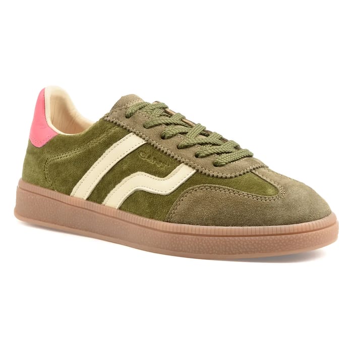 The Low sneakers Cuzima from the Gant brand are designed for fashion lovers who are looking for a versatile style for their daily activities. These low base shoes are elegant and comfortable, with an olive velvet leather upper and light beige accents. The side panels feature white zigzag stripes, while the laces are made of green olive and pass through fabric eyelets. A pink patch is visible at the heel. The rubber soles are slightly brown and feature textured traction patterns. The interior lining is made of leather or synthetic material in cream color. Details of the shoe include a velvet leather basket and velvet leather. The Low sneakers Cuzima are available in green and are ideal for everyday activities, walking or leisure. -