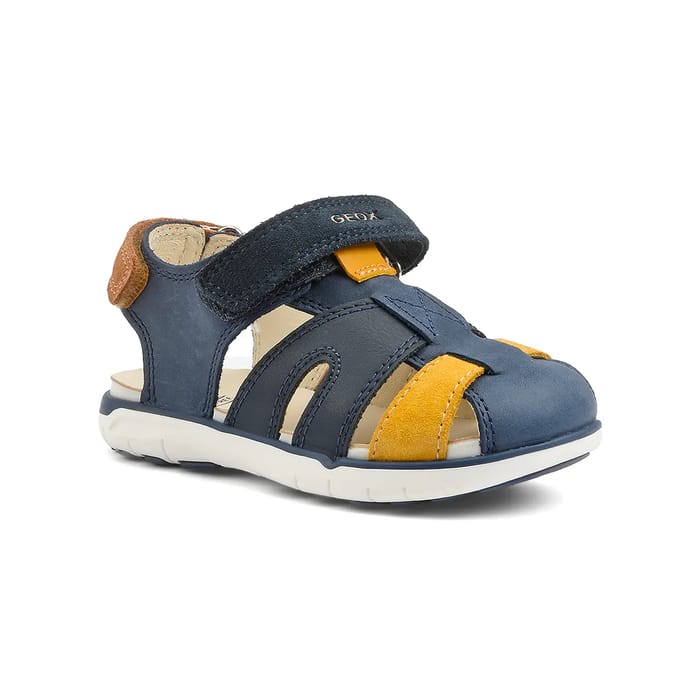 Discover the Delhi sandals from Geox, ideal for holidays or summer days. These nubuck and suede flat sandals offer exceptional comfort and breathability thanks to their leather insole and outsole rubber. The top, in nubuck and velvet leather, is available in navy blue, with yellow accents and brown leather details. The adjustable hook and tongue shoulder strap ensures a secure attachment of the foot. The multiple ventilation holes ensure optimal ventilation. Children will be able to walk with lightness and comfort, while enjoying a breathable sole that ensures optimal well-being from the first steps. -