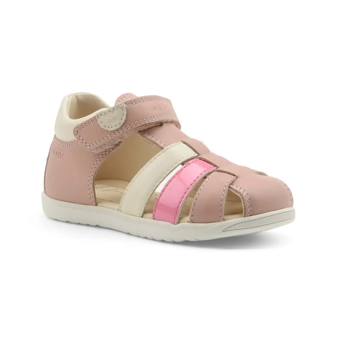 The flat MACCHIA sandals from Geox combine elegance and comfort for everyday use, ideal for holidays or summer walks. Designed in a subtle blend of leather and synthetic material, they perfectly fit the shape of the foot thanks to a lightweight and breathable rubber sole, signature of the brand. This innovative technology ensures an immediate feeling of well-being, even after long hours worn. The model stands out for its casual and feminine design, with a touch of pink that pairs with both a summery look and more casual outfits. The three straps, including an adjustable strap with a Velcro closure, ensure optimal support while remaining easy to put on. The leather lining and insole enhance comfort, while the overall breathability keeps your feet cool and comfortable even in the sun. Perfect for children and adults alike, this sandal embodies the Geox spirit: combining performance and style for moments of relaxation or adventure without compromise. -