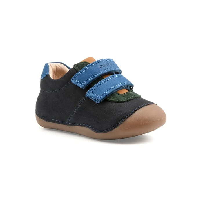 Tutim, children's shoe of the brand Geox, offers comfort and well-being from the first steps. This shoe features a navy blue nubuck upper and upper, which guarantees durability and resistance to wear. The soft leather lining ensures a feeling of comfort and warmth. The leather insole is removable, making maintenance and replacement easy. The rubber outsole offers solid protection and natural flexibility. The two adjustable Velcro straps allow for an easy and fast fit. The Geox logo is printed on one of the stripes in light blue embroidery. -
