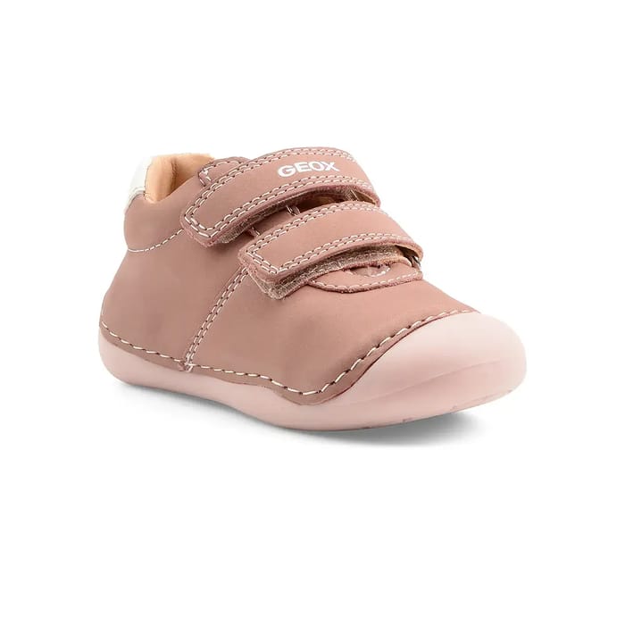 The Tutim ankle boots from Geox combine style and comfort for your child's first steps. Designed in a soft and resistant nubuck material, they offer a secure fit thanks to two adjustable Velcro straps. The genuine leather upper and leather inner lining ensure optimal comfort throughout the day. The lightweight, flexible rubber sole promotes easy walking, while neat stitching details add an elegant touch. Available in pastel pink, these ankle boots are part of a chic, versatile and comfortable range, ideal for everyday use. The sleek design and stylish finishes perfectly match any everyday outfit. Thanks to their breathable sole, famous for its efficiency, these Geox shoes ensure well-being and lightness from the first steps. -