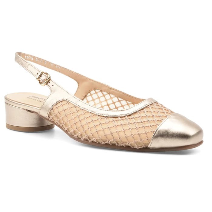 The ROMA H of the brand Hassia embody timeless elegance and discreet refinement, perfect to sublimate every moment of your daily life. These slingbacks brilliantly combine a metallic leather and textile upper, offering a texture that is both sophisticated and modern. The metallic leather, tinted with a bright bronze, captures light for an effect that is both bold and subtle, while the textile brings a touch of ease and lightness. The leather lining and insole ensure optimal comfort even after long hours worn, while the synthetic outsole ensures discreet stability. Ideal for evenings, events or business days, these shoes stand out for their 30 mm heel, combining elegant height and comfort. Their sleek design, marked by a sling detail in metallic leather and textile, makes them versatile pieces, both chic and timeless. A perfect fit is ensured by a small buckle on the strap, allowing to customize the hold around the ankle. The ROMA H are much more than a pair of shoes: they are a statement of style, where refinement and modernity meet to create an unforgettable silhouette. -