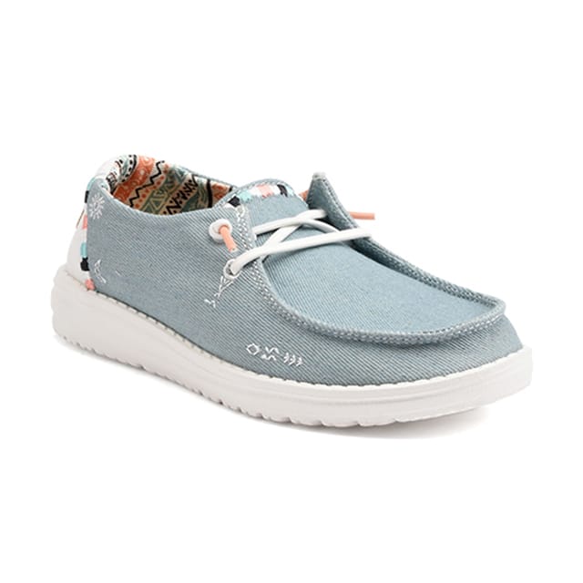 Wendy Boho from Hey dude, it's a casual and practical slip-on shoe, ideal for your leisure, your daily life and your relaxation. This shoe is made of textile, with a textile top and upper, and a textile lining also. It has a removable foam insole and a rubber outsole. Its textile slip-on facilitates threading, offering unparalleled comfort and lightness. The shoe is available in sky blue, a color that evokes freedom and joy. Details of this shoe include white laces and an interior lining decorated with geometric patterns in different colors, such as orange, black and green blue. The subtle decorative stitching on the top adds a touch of sophistication to this casual shoe. -