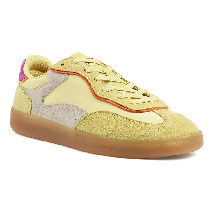 The Hoff PARK shoes are sneakers designed for fashion and comfort lovers. These trendy shoes, available in yellow, combine a textile suede top and upper for an optimal feeling of comfort. The textile lining ensures optimal insulation and protection. The textile and removable insole facilitates cleaning and customization. The synthetic sole offers durability and wear resistance. The heels measure 20 mm, offering lightness and ease of walking. Details of these shoes include a velvet leather and textile sneaker, with orange stitching along the edges. The light laces pass through eyelets, while a small purple accent is found near the heel collar. The perforations on the sides ensure optimal ventilation. -