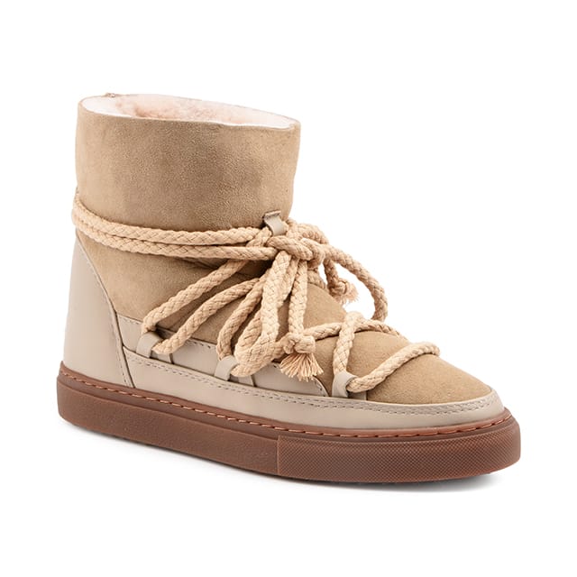 The Inuikii Classic warm ankle boots are designed for general and everyday use. They offer exceptional support and comfort thanks to their synthetic sole and 15 mm heel. Their beige velvet suede top is lined with an inverted sheep lining for added warmth. The sheepskin insoles are removable for easy maintenance. The Classic ankle boots are also equipped with metal eyelets for an accurate fit of braided string laces. Their versatile and comfortable design makes them ideal for a range of activities, from hiking to the city. -