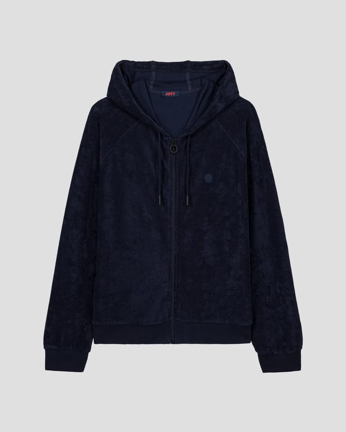 The M's MOJAVE of the brand Jott is a casual and cozy sweatshirt designed for everyday activities, relaxation and leisure. This sweatshirt is woven from 72% cotton and 28% polyester, offering a perfect balance between comfort and versatility. The hoodie-zipped style is ideal for cold weather or for an evening in the city. The M's MOJAVE is available in navy blue, a dark and elegant color that will suit all styles. Details of this sweatshirt include elasticated sleeves and waistband for a comfortable fit, as well as a discreet logo on the left chest. The M's MOJAVE is a perfect choice for those looking for a warm and comfortable garment for their daily activities. -