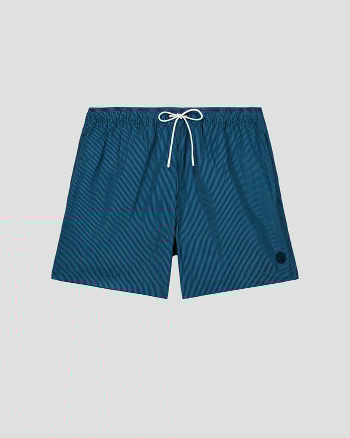 The swim shorts M's NIOLON STRIPE of the brand Jott are designed for summer activities. These sporty swim shorts are made of 100% polyester, a lightweight, breathable material that dries quickly. They offer optimal support while guaranteeing optimal comfort for water activities. The M's NIOLON STRIPE swim shorts are perfect for beaches, swimming pools or water sports. They feature an elastic waistband and a white silk cord for an easy fit. Their sleek, minimalist design, with a small dark emblem near the hemisphere, adds a touch of style to these swim shorts. -