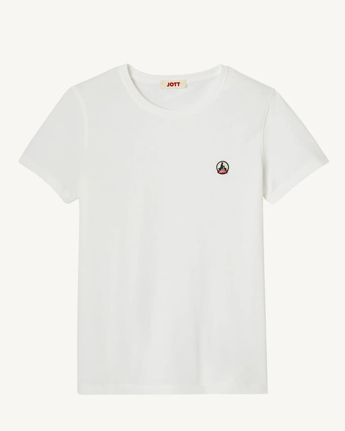 The T-shirt W's Rosas by the brand Jott is a casual and basic clothing ideal for your daily life, your leisure or your work. This short-sleeved t-shirt is made from 86% organic cotton and 14% recycled polyester, offering breathability and optimal comfort. The color is pure white, perfect to be worn with any type of clothing. The Jott brand logo is visible on the left pocket, in the form of an embroidered patch with a small circular pattern and the inscription "JOTT". The fabric is thin and light, providing a pleasant feeling against the skin. This T-shirt is versatile and suitable for all uses. -