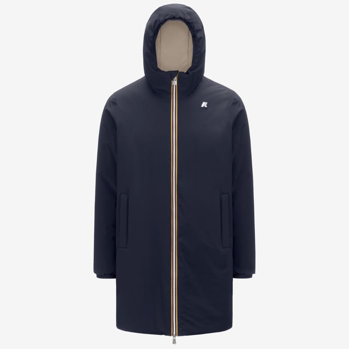 Jacket rain M's Jacob Warm double of the brand K-way. This waterproof jacket is designed for outdoor activities and rainy days in the city. It is made of 92% nylon and 8% elastane, which gives it exceptional lightness and flexibility. The lining is made of 100% polyester for optimal weather protection. The jacket has two side pockets on each side, near the bottom of the skirt, to store your accessories. The collar is high and closed by a long zip at the front, while the cap is also high and can be raised to protect your face from rain. A small white "R" logo is visible on the left chest, above the zipper line. The zip is equipped with a striped gold-yellow handle for easy grip. The sleeves are long, covering part of the wrists, for complete protection against the elements. The jacket is available in navy blue, an ideal color for rainy days. -