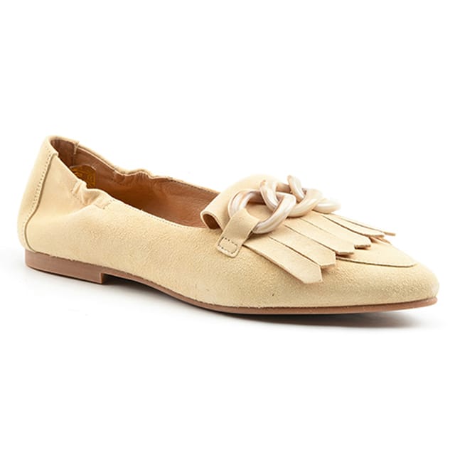 The Antes of the brand Kmb are classic loafers that combine refinement and comfort. These shoes are designed for formal occasions, such as evenings or events, and are also perfect for the office. Their suede top and stem and jewelry insert add an elegant touch to their design, while the leather lining ensures optimal comfort. The Antes are available in a single color, beige, which harmonizes with the product range "chic, formal". Their heel measures 10 mm, which gives them an elegant look without being too high. The details of these loafers include a velvet leather design and fringes along the vamp, adding an elegant touch to their design. The leather insole and synthetic outsole ensure optimal protection and durability. -