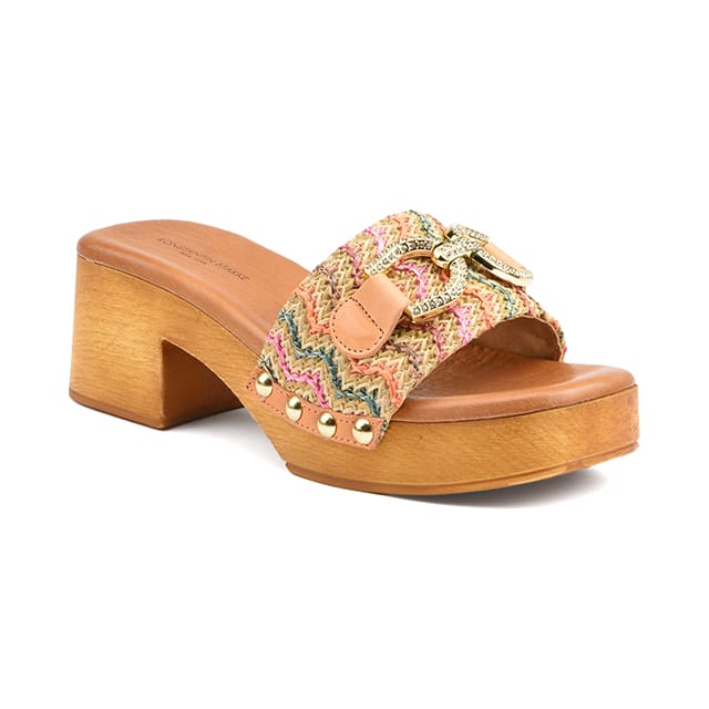 Discover the Pinos from the Konstantin Starke brand, a high-end mule model designed for fashionistas looking for unique models. These casual and comfortable shoes are perfect for outings, for everyday wear, summer or for a relaxing break. The upper part of the shoe is made of multicolored raffia, with shades of pink, yellow, blue and green that blend into an entangled pattern. A large light leather bandoulier, adorned with a gold buckle and small crystals or rhinestones, attaches around the front part of the shoe. Metallic nails on the sides, near the heel area, add an additional decorative element. The heels measure 55 mm and are made of synthetic, while the inner and outer soles are made of leather. The lining is also made of leather, providing optimal comfort. The Pino by Konstantin Starke are designed to be lightweight and comfortable, while being a unique and elegant fashion piece. These shoes are ideal for women who are looking for a casual and comfortable style while wanting to stand out from the crowd. The Pino by Konstantin Starke is a high-end collection for fashionistas who appreciate details and neat finishes. -