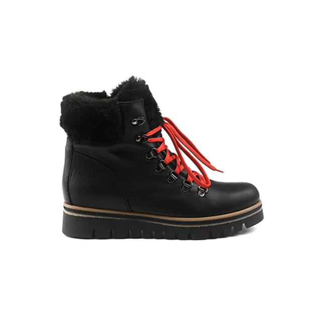 The Panna snow boots from La Thuile are designed for winter outdoor activities. They feature a sturdy leather top and upper, providing protection from the elements. Their sheep wool lining ensures optimal comfort, while the rubber sole ensures total waterproofness. The ankle boots are equipped with leather laces, fixed by silver eyelets. The heel measures 20 mm and the insole is made of wool. The color is black, making them ideal for winter activities. The Panna ankle boots are designed to offer warmth, waterproofness and comfort, making them perfect for snow hiking or winter outings. -