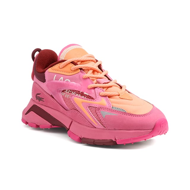The Lacoste L003 NEO TECH are trendy and fashionable sneakers designed for sports and leisure lovers. These shoes are stylish and functional, with a nubuck and textile upper and upper that offer a combination of comfort and style. The textile lining ensures extra softness, while the textile and removable insole makes cleaning and maintenance easy. The synthetic sole offers durability and wear resistance. The Lacoste L003 NEO TECH are available in an attractive pink color that perfectly suits the brand's trendy and fashion product range. These shoes are designed to be worn every day, whether for walking, leisure or sports activities. Their functional appearance is focused on fashion, comfort and versatility, making them ideal for people looking to stand out while staying comfortable. The details of these shoes are carefully designed to offer a unique wearing experience. The colorful peach cotton laces are fitted through eyelets that match the color scheme, adding an elegant touch to the shoes. A small draw button is visible on the back near the heel collar, which is marked with a dark red hue. The midsole is thick and features different textures and colors, contributing to its sporty design. The Lacoste L003 NEO TECH are a great option for those looking to combine style and functionality in their shoes. -
